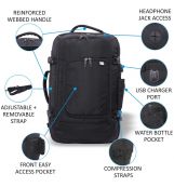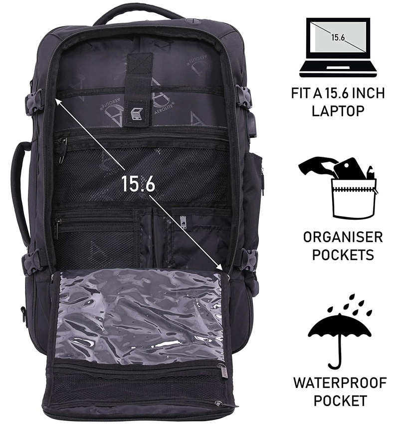 Prostorná hlavní kapsa je vybavena stahovacími pásy na oblečení a boty. Prostřední kapsa je pro vaši technologii - s prostorem na notebook (vhodné pro obrazovky do velikosti 15,6 ”) a menšími kapsami na příslušenství. Má také vodotěsnou kapsu na toaletní potřeby. Menší přední kapsa je ideální pro psací potřeby a menší věci. Navíc je na boku dokonce držák na láhev.