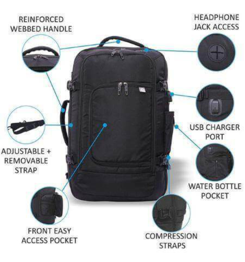 Toto zavazadlo má polstrované ramenní popruhy a záda ze síťoviny a lze je nosit jako batoh pro přepravu bez použití rukou. Popruhy lze schovat, když je nepoužíváte, v praktické kapse na zip. Můžete ho také nosit na rameni pomocí odnímatelného ramenního popruhu, nebo v ruce pomocí měkké vyztužené horní nebo boční rukojeti.