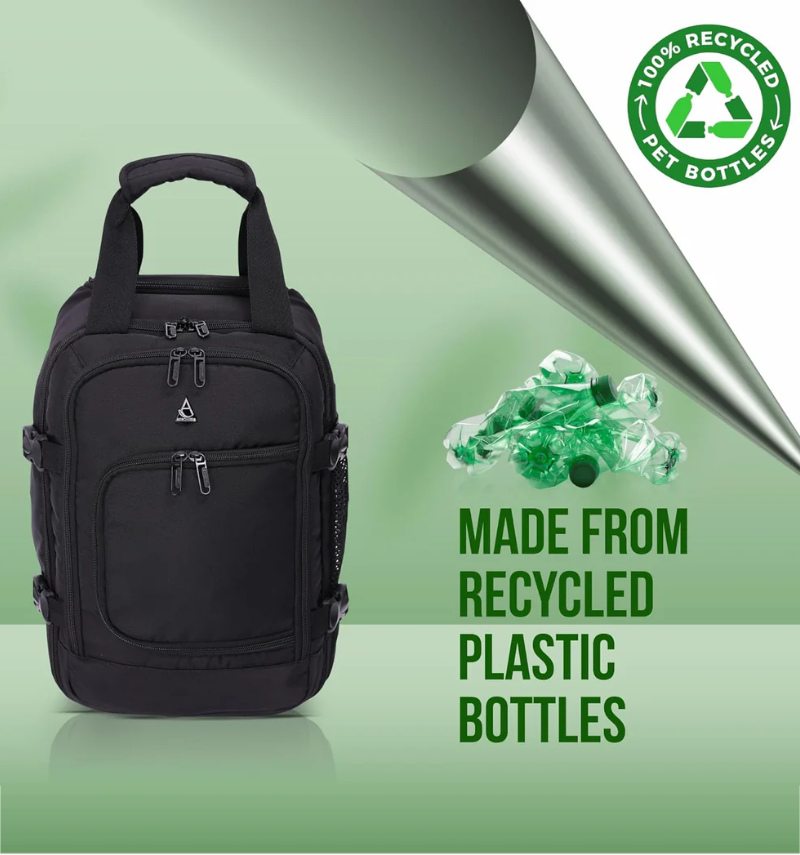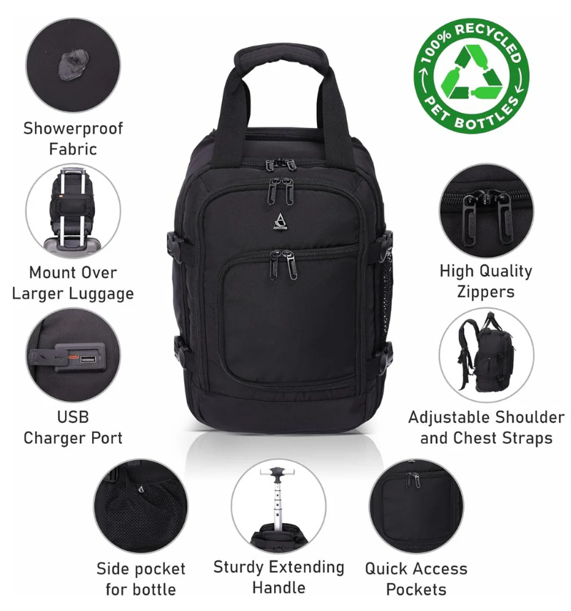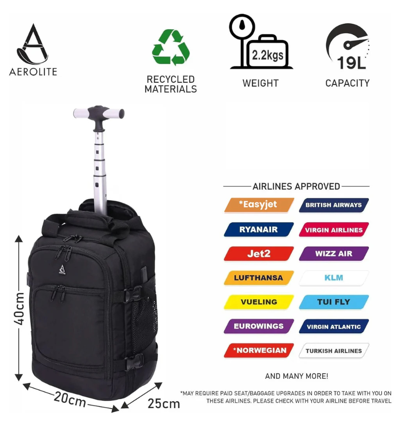 Popis produktuBatoh na kolečkách z kolekce AEROLITE. Víceúčelový design 3v1 vám umožní přepravovat věci přesně tak, jak potřebujete: Toto zavazadlo je vybaveno polstrovanou síťovanou zádovou opěrkou a lze ji nosit jako batoh pro přepravu bez použití rukou. Popruhy lze v době nepoužívání uložit do praktické kapsy na zip, která je součástí balení. Batoh lze také přenášet v ruce jako příruční zavazadlo pomocí měkkých vyztužených horních držadel nebo ho lze vézt pomocí teleskopického výsuvného madla. Na zadní straně batohu je umístěn otvor, kterým můžete prostrčit výsuvné madlo cestovního kufru. Tento batoh je ideální pro ty, kteří rádi cestují na lehko. Má tři kapsy na zip: Prostorná hlavní přihrádka je vybavena popruhy na oblečení a obuv. Prostřední kapsa je určena pro vaši techniku; obsahuje kapsu na tablet s úhlopříčkou až 10,1" a menší kapsy na příslušenství. Má také vodotěsnou kapsu na toaletní potřeby. Menší přední kapsa je ideální na psací potřeby a menší věci. Navíc je na boku i držák na láhev s vodou. Taška je vybavena vestavěným USB nabíjecím portem na vnější straně, takže můžete snadno nabíjet svá mobilní zařízení na cestách. Jednoduše vložte svůj vlastní powerpack do vnitřní kapsy (hodí se pro powerpacky do velikosti 18x8x2 cm - powerpack není součástí dodávky) a pomocí dodaného USB kabelu jej připojte k portu. K nabíjení zařízení pak můžete použít vlastní nabíjecí kabel, aniž byste museli po kapsách tahat těžký powerpack. Taška má speciální tajný skrytý oddíl s podšívkou blokující RFID - takže vaše kreditní karty jsou v bezpečí před podvodníky na cestách. Zipy YKK byly pečlivě navrženy tak, aby vyhověly i těm nejnáročnějším testům odolnosti proti oděru a zajistily, že obsah vašeho zavazadla je dobře chráněn. Batoh je trvale udržitelný, protože vnější materiál je vyroben z recyklovaných plastových lahví, což pomáhá životnímu prostředí a zároveň přeměňuje odpad na výrobky, ze kterých můžete mít dobrý pocit. Na batoh se vztahuje 10-ti letá záruka, která se vztahuje na všechny výrobní vady, abyste měli naprostý klid. Tento ekologický batoh na kolečkách má rozměry 40 x 20 x 25 cm, což je přesně maximální povolená velikost, kterou si můžete vzít zdarma do kabiny při letu se společností Ryanair. Je také akceptován prakticky všemi hlavními leteckými společnostmi po celém světě, včetně: Wizzair, EasyJet, British Airways, Emirates, Qatar a Lufthansa a další. • materiál: polyester | |||||||||||||||||||||||||||||||||||