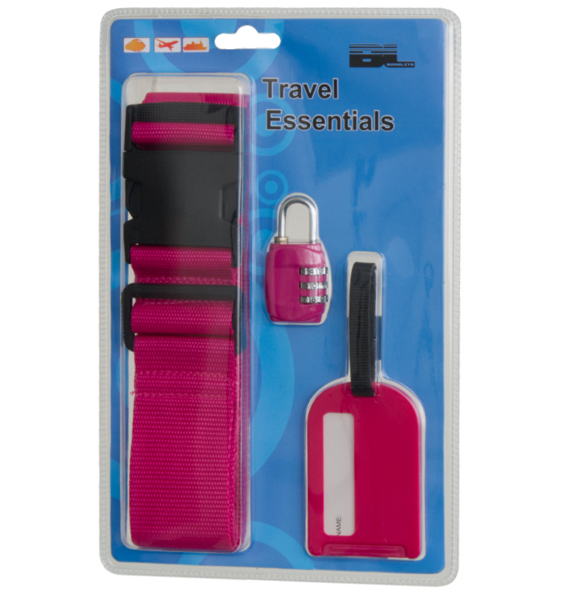 Popis produktuCestovní set obsahuje tyto 3 položky: 1) Bezpečnostní popruh na kufr s kódovým zámkem Popruh je zabezpečen proti otevření kódovým zámkem. Popruh má extra silnou přezku a je použitelný pro všechny velikosti kufrů. šířka: 5 cm délka: 183 cm Jmenovka na zavazadlo pro snadnou identifikaci Vašeho zavazadla. Pro zapsání kontaktních údajů vysuňte štítek.