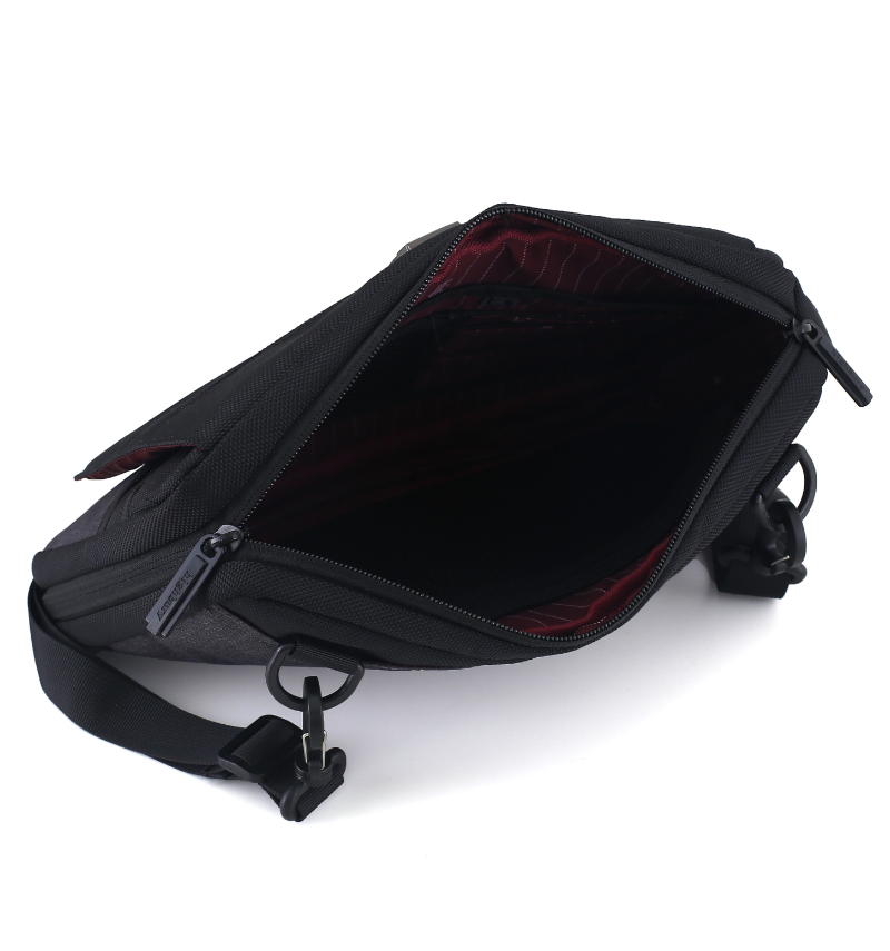 Hlavní prostor je uzavíratelný zipem, je polstrovaný, vhodný k uložení např. tabletu, obsahuje organizer. Kromě hlavního prostoru má taška na přední straně spoustu kapes krytých klopou, na které je malá kapsa na zip.